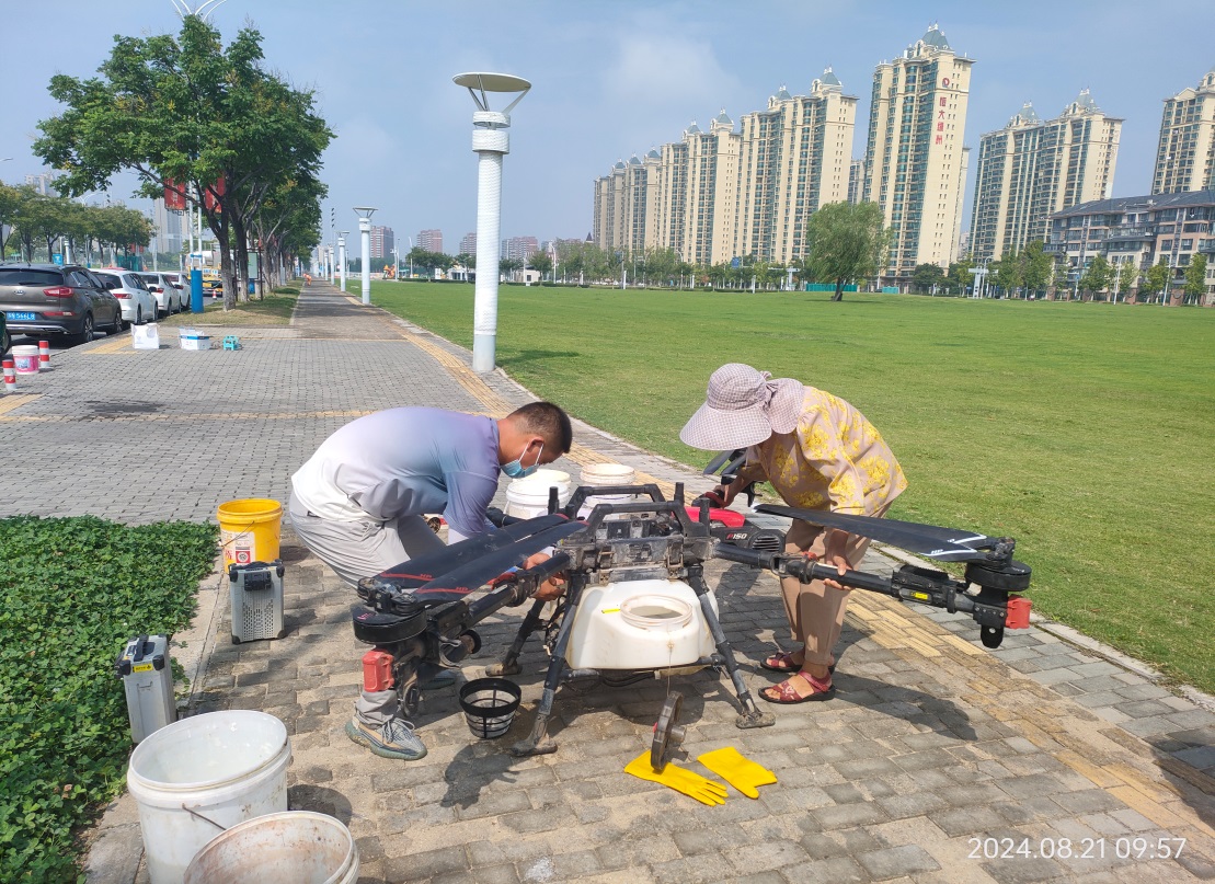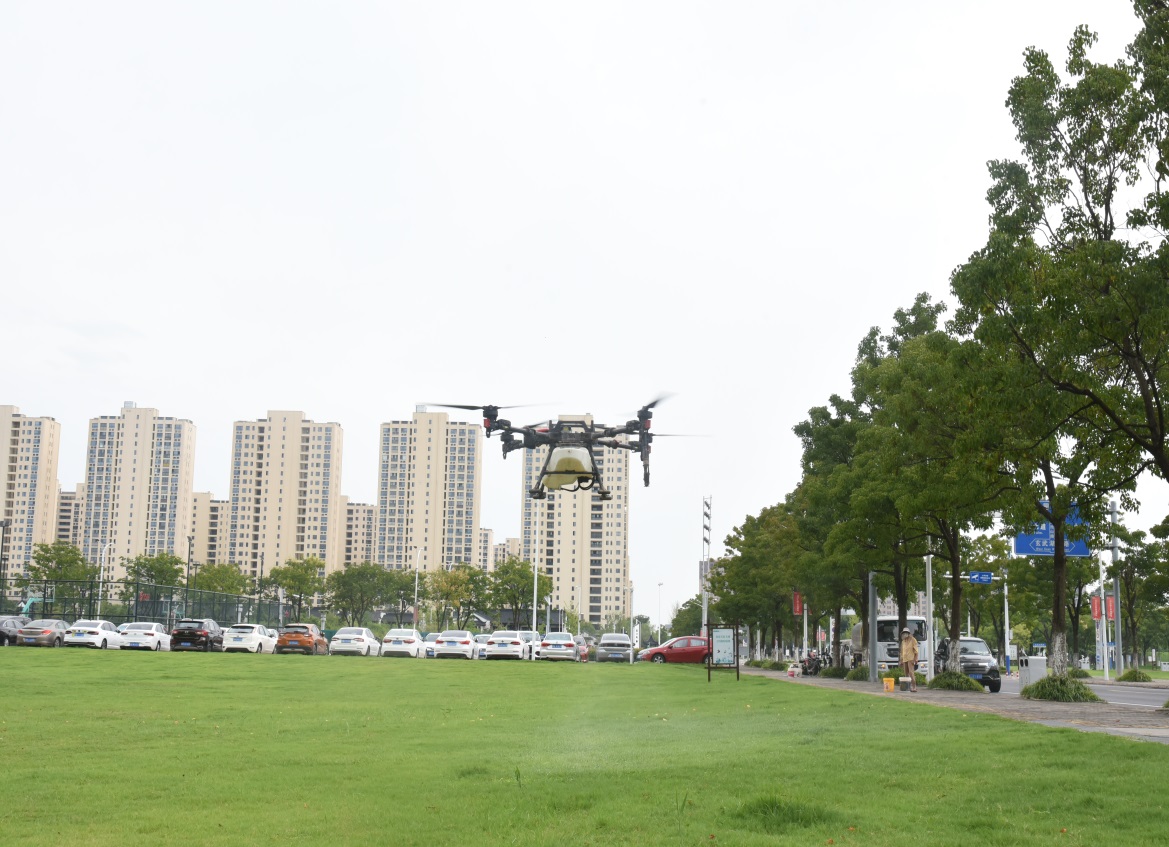 8月21日上午,在園區(qū)中央商務區(qū)開放綠地,一臺無人機正在勻速飛行,對中央商務區(qū)25萬平方米草坪開展病害防治。