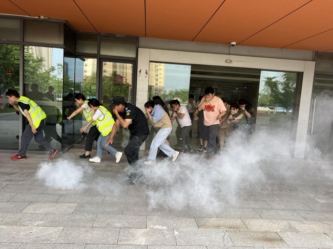 隨著警報聲拉響,模擬演練生產(chǎn)力中心出現(xiàn)火情,現(xiàn)場巡查員發(fā)現(xiàn)火情后立即上報,啟動消防應急預案,指揮組、滅火組、疏散組、救護組、警戒組、保障組等成員按照分工,有條不紊地組織義務消防隊員開展撲救火災、現(xiàn)場救護傷員、疏散樓內(nèi)職工、現(xiàn)場警戒等工作。